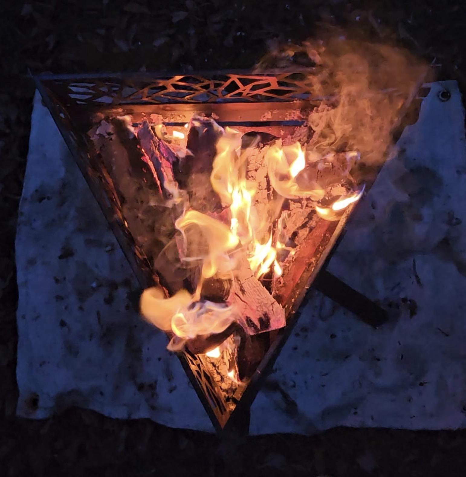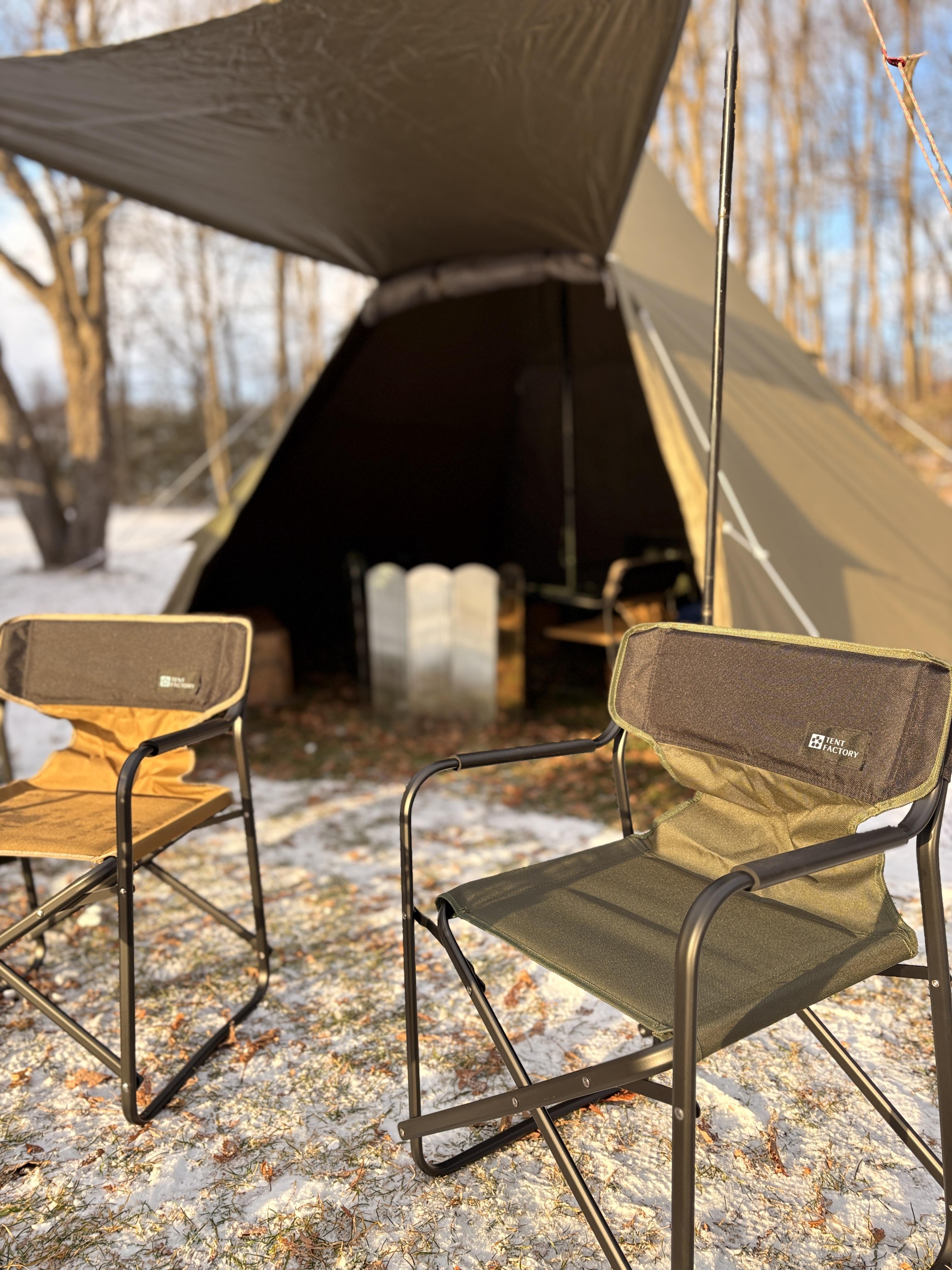 ワンポールテント、焚き火台、石油ストーブを屋外リビングスペースにご用意。